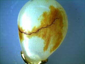 图9 贴皮 市场上常见一些开过天窗的“子料”,小面积露出的部份很白,其他部分都被 “皮”包裹着。放大仔细观察,开窗部位实际上是人为粘贴了白玉的薄片或块,而“子料”本身则是质量较差的和田玉原石,甚至是其它抵挡的玉石如石英岩、大理石、蛇纹石等等。 图10所示是在实验室检测到的样品,打眼这么一看,除了“皮”,露出的肉很细腻、很白,让人觉得这是一件多么好的子料呀,可是在显微镜下放大观察,不得了了,白肉边上怎这么多的气泡,荧光灯下一照,在这块白玉的边缘是一圈强蓝白色的荧光。用红外光谱仪检测,白色部分和黄色部分根本不是一样的东西,白色是和田玉,可体积占大部分的黄色部分是蛇纹石。这一件的样品的陷阱是蛇纹石原石上先贴上和田玉薄片后,再进行雕琢,把粘合的缝隙巧妙的掩盖住了,让你肉眼根本看不出来,让人以为这是一个整体。所以千万一定要注意开过天窗的“子料”!  图10 虽然实验室里目前已检测到不少的子料,也检测了许许多多的仿子料或者经过处理的子料,但这些数量只是玉石市场上的冰山一角,在玉石市场上真真假假的子料、仿子料都混在一起,鱼龙混杂,当你站在这些玉石面前时,仅凭肉眼和经验及随身携带的几件小仪器,可以粗略作些判断,但遇到复杂的作假手法时,很难做出准确的判断,被忽悠的可能性就大了。 论经济损失,其中可能造成损失最大的是和田玉的仿制材料当成和田玉子料购进,虽然这种情况鉴定对内行人而言,相对是容易的。但业外不乏上当受骗者,甚至是业内不时有走眼的案例出现。 山料仿子料,其损失主要是在山料与子料的价差上。源头供应方面不断地改进技术,提高相似度,鉴定难度在不断增加。其中也存在一些结论行业内不同人看法不一或有争议的现象,但借助实验室仪器设备的观察和测试,大大克服了仅凭肉眼经验判断的不确定性。 子料的二次改造方面,笔者一直认为,此举颇有“画蛇添足”之嫌。不仅掩盖了天然皮色之纯朴自然美,反而增加了人工作伪的“瑕疵”。不知改造者是否可以认识到,或什么时候才会认识到,其原意是为了提高子料价值,但实际造成了对子料天然性的损伤,反而降低了子料的天然价值。每每甚是惋惜,不禁呼吁珍惜你手中天然之物。 目前市场中子料的价格远高于山料、山流水,这是历史留存的问题,也需要随业者对货品价值的认识、消费者对和田玉认识程度的提高、整体市场的成熟发展过程,不断地加强大家追求和田玉的品质价值意识,逐渐改变目前片面追求产地、子料、羊脂玉等交易和消费误区,形成一个共识:无论产自何国何地、无论山上水中,和田玉的颜色、质地、油润度、雕刻工艺水平等方面,才是决定和田玉品质价值的重要因素。