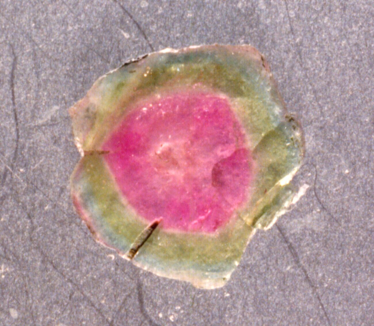 图2:巴西帕拉伊巴碧玺饰品(图片由北京菜市口百货股份有限公司提供) 多色碧玺:包括西瓜碧玺(中心部位为红色,周围绿色)、三色碧玺等。 正是这种在于一颗碧玺上可有多种颜色的环带(图3),充分展现了碧玺晶体生长过程的致色元素变化过程,留下丰富多彩的生长记录。