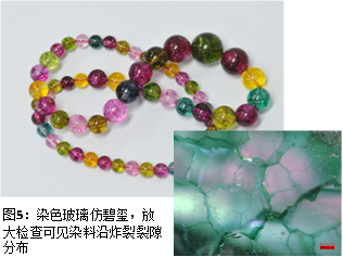 图4:碧玺项链中混有其它宝石品种 除了在碧玺饰品中混杂其它低档宝石品种外,更恶劣的情况还会见到用各色染色玻璃冒充碧玺的情况。此类送检样品多见于零散客户送检样品中,(图5)就是NGTC实验室近期接收的一件样品,客户花了几千元购买的“碧玺”项链,经检测,结果是染色玻璃。